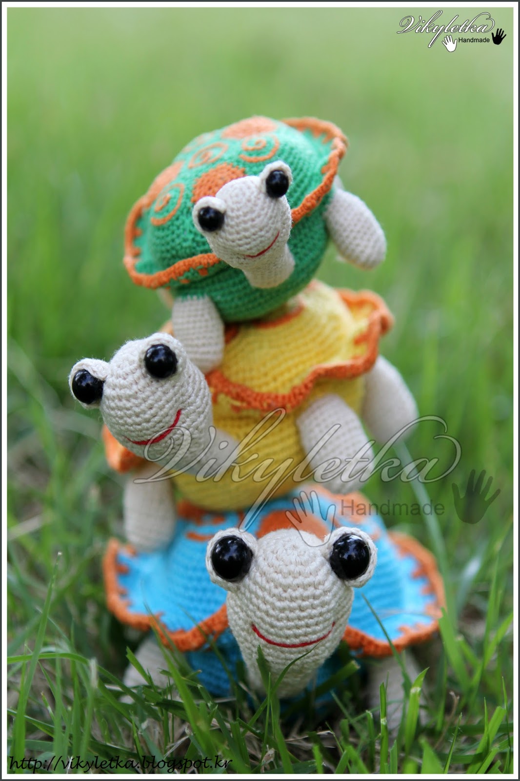 Вязала игрушки из котоновых ниточек голубого, желтого, зеленого, оранжевого и бежевого цвета! Добавила оранжевый цвет в каждую черепашку, чтобы был один общий цвет схожести который нас объединяет в семью! Внутри проволка тонкая, чтобы ножки двигались и шея с головой вверх смотрела! Как обычно внутри синтепон. А глазки из бусинок. Размеры в диаметре панциря такие: папа - 10 см (в 3 нитки), мама - 8,5 см (в 2 нитки), Тимурка - 6,5 см (в 1 нитку).Черепашки получились немного другие, так как я поменяла дизайн в панцире и головы и лапки связала по-своему! Очень довольна результатом, хоть и трудиться пришлось понемногу, но 2 недели!